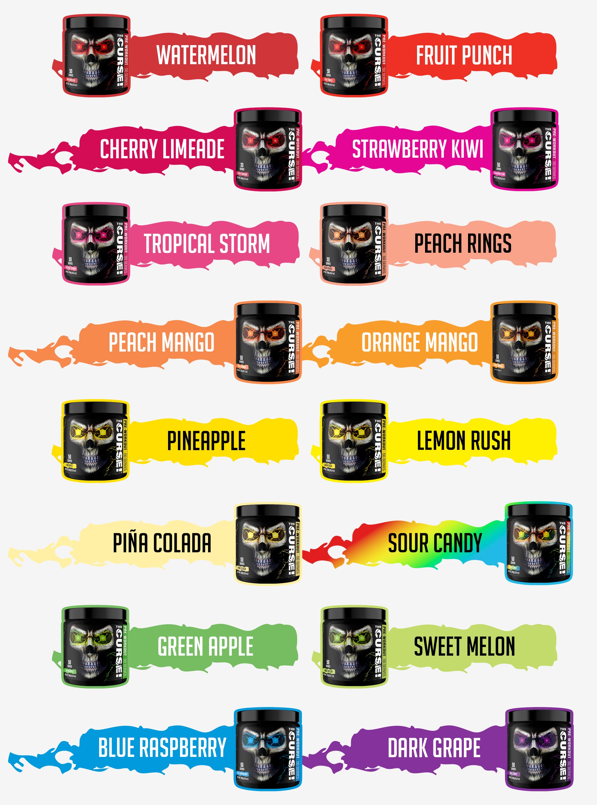Every tub of The Curse! packs 50 servings — that’s less than 60 cents per workout. There are 16 refreshing flavors to choose from. Mix one scoop with 6–8 oz of cold water for a delicious taste with zero grit.